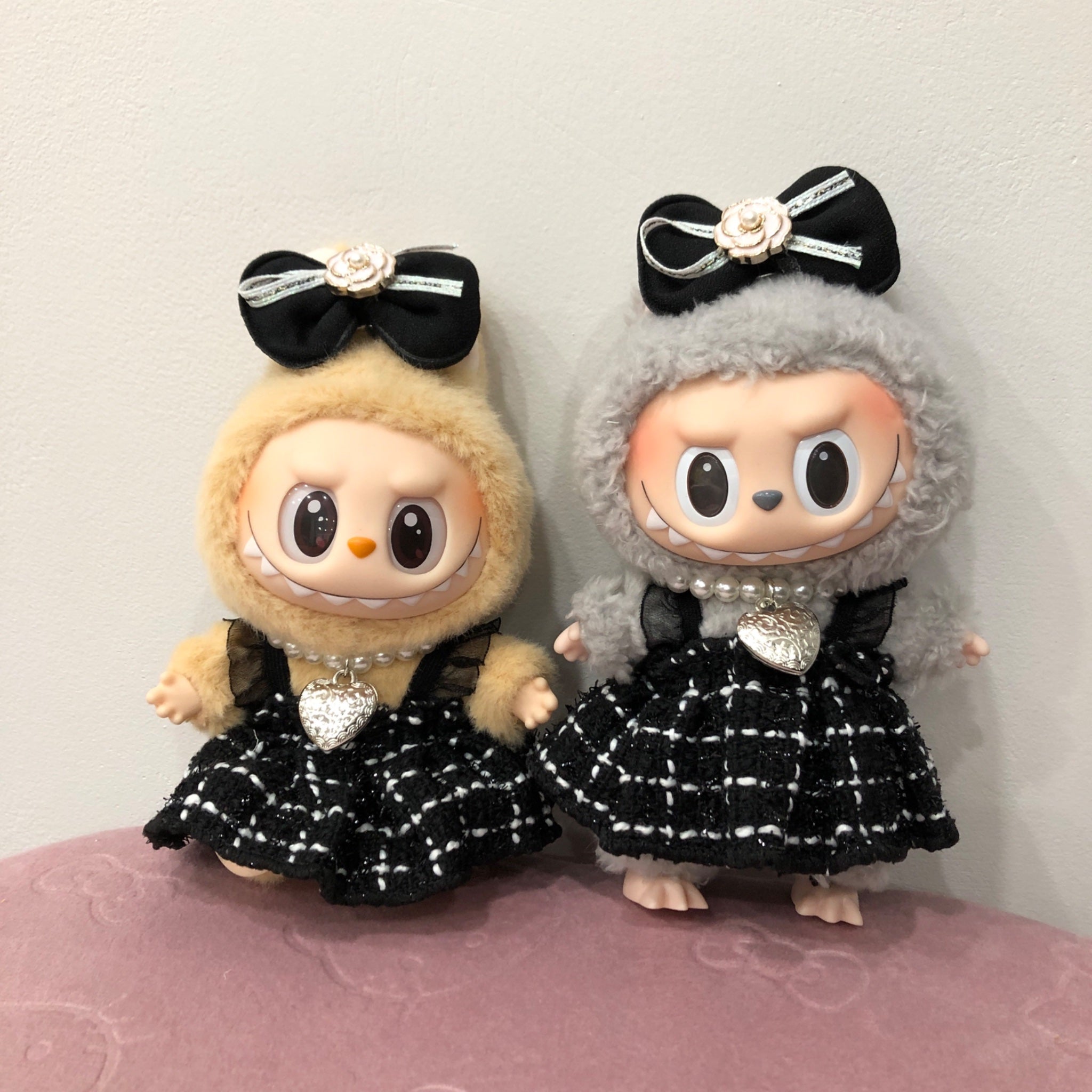 The Black Dress with Necklace Set comes with a cute black dress, a pearl necklace with heart pendant and a matching hair bow. Please note listing is for ONE set of the outfit only and does not come with the Labubu(s) that's working hard to model the clothes for your reference.