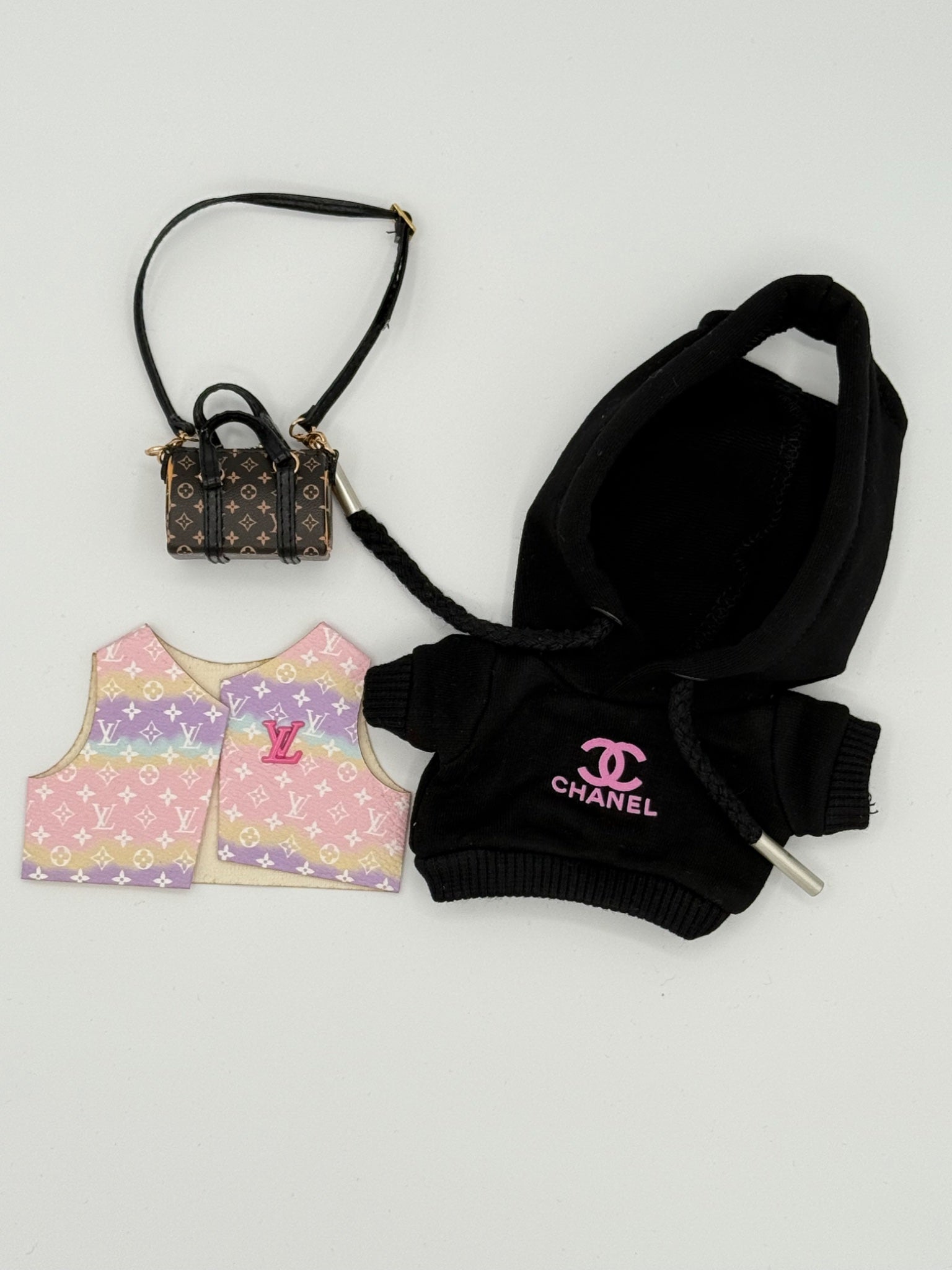• Black "C" Hoodie + Rainbow Vest + Bag - Labubu Clothes