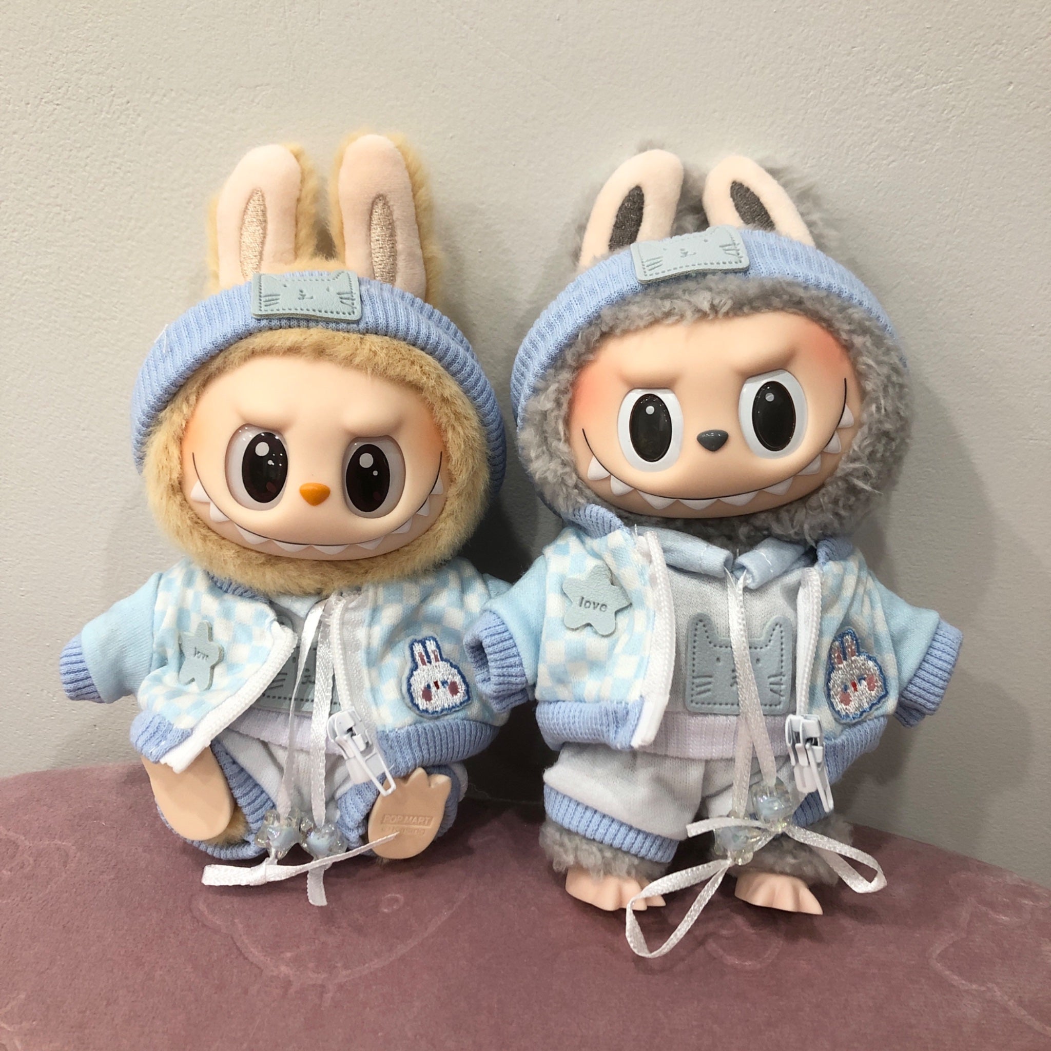 The Blue Streetwear Set comes with a cute blue cat hoodie, matching panys, a cute blue bunny jacket and a matching blue headband. Please note listing is for ONE set of the outfit only and does not come with the Labubu(s) that's working hard to model the clothes for your reference.