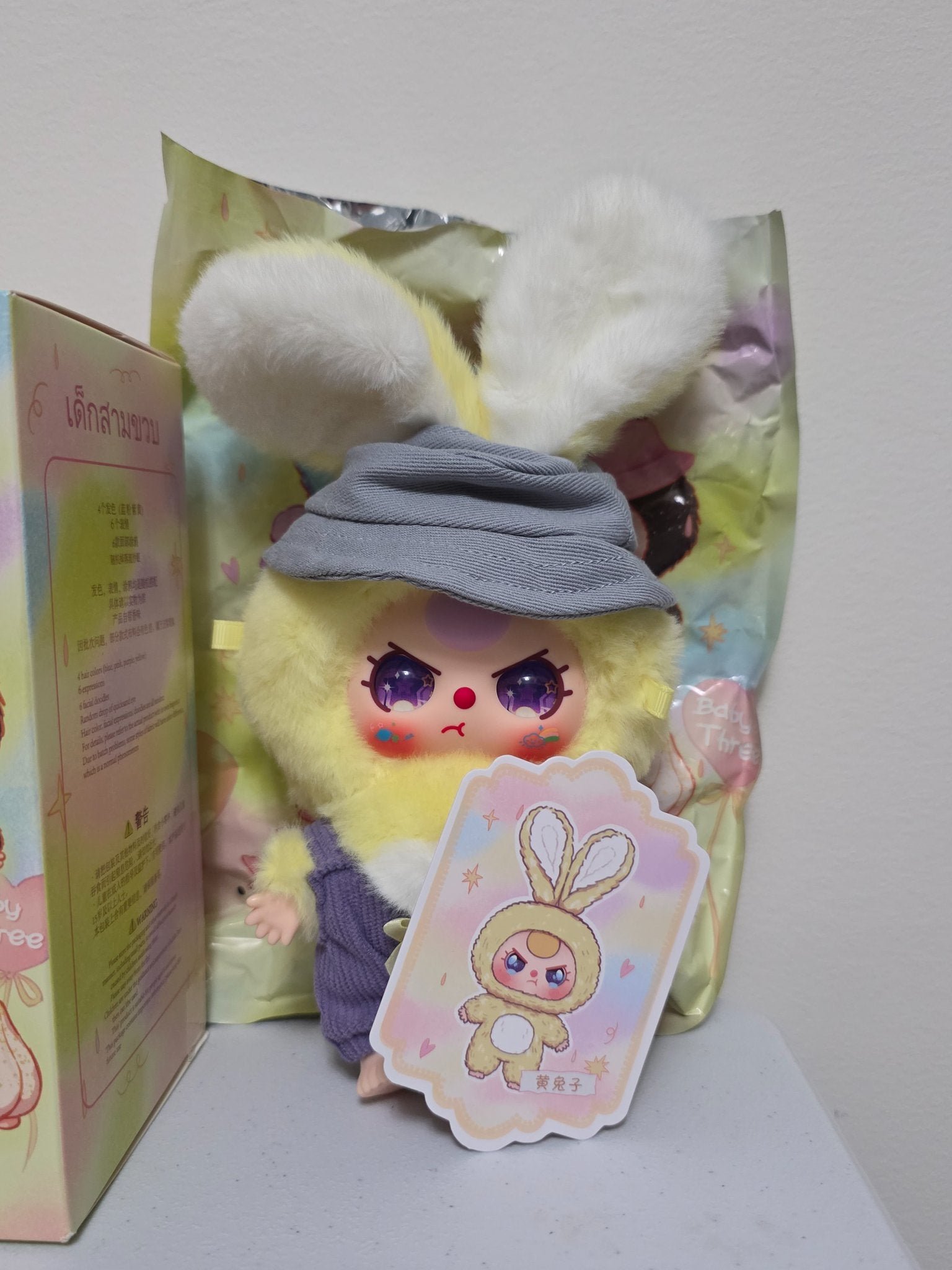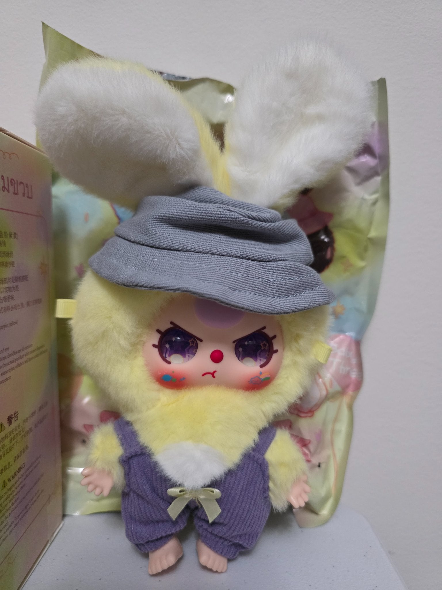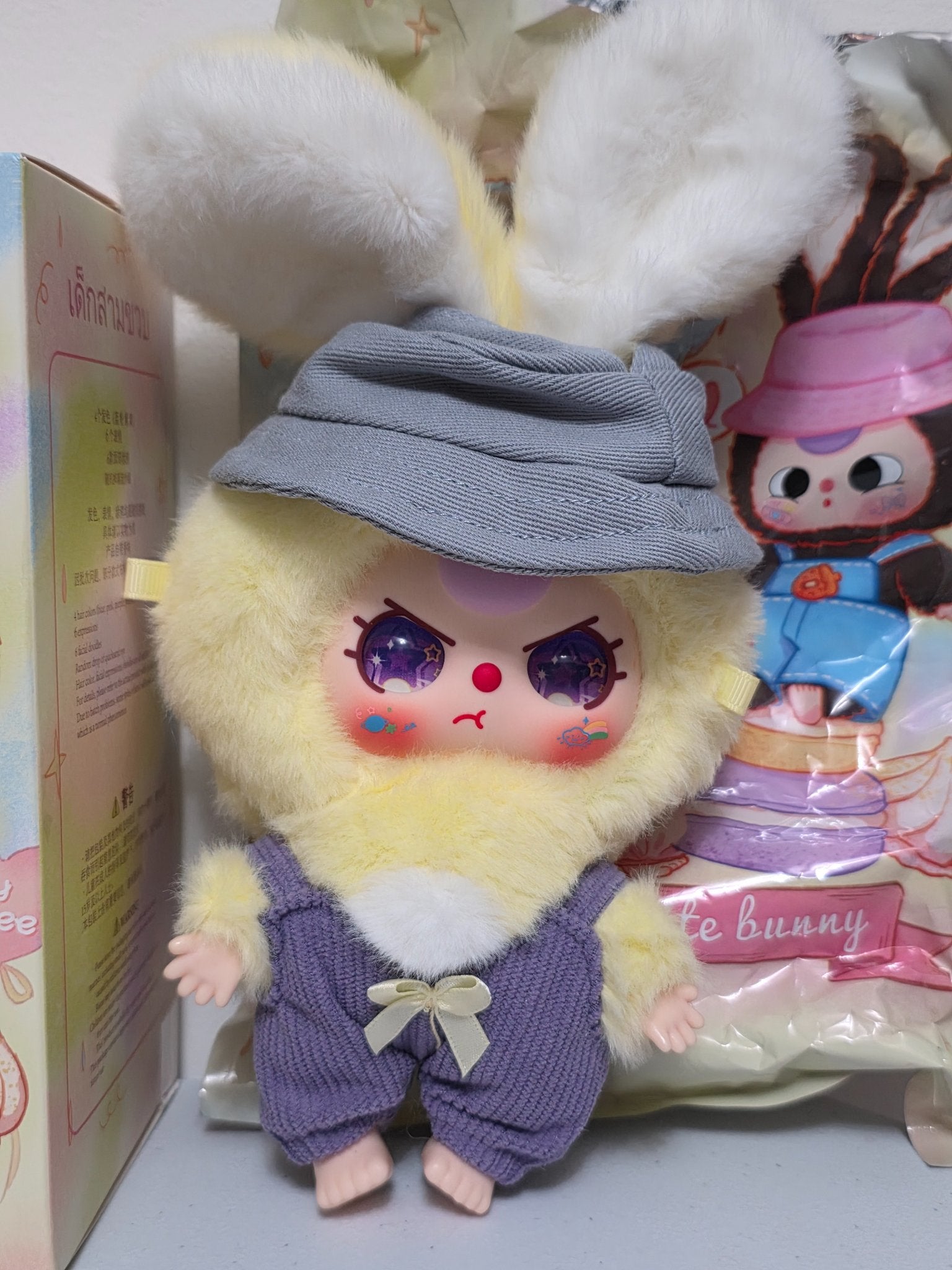 Special purple star eyes on a yellow bunny with overalls and bucket hat. Cute!