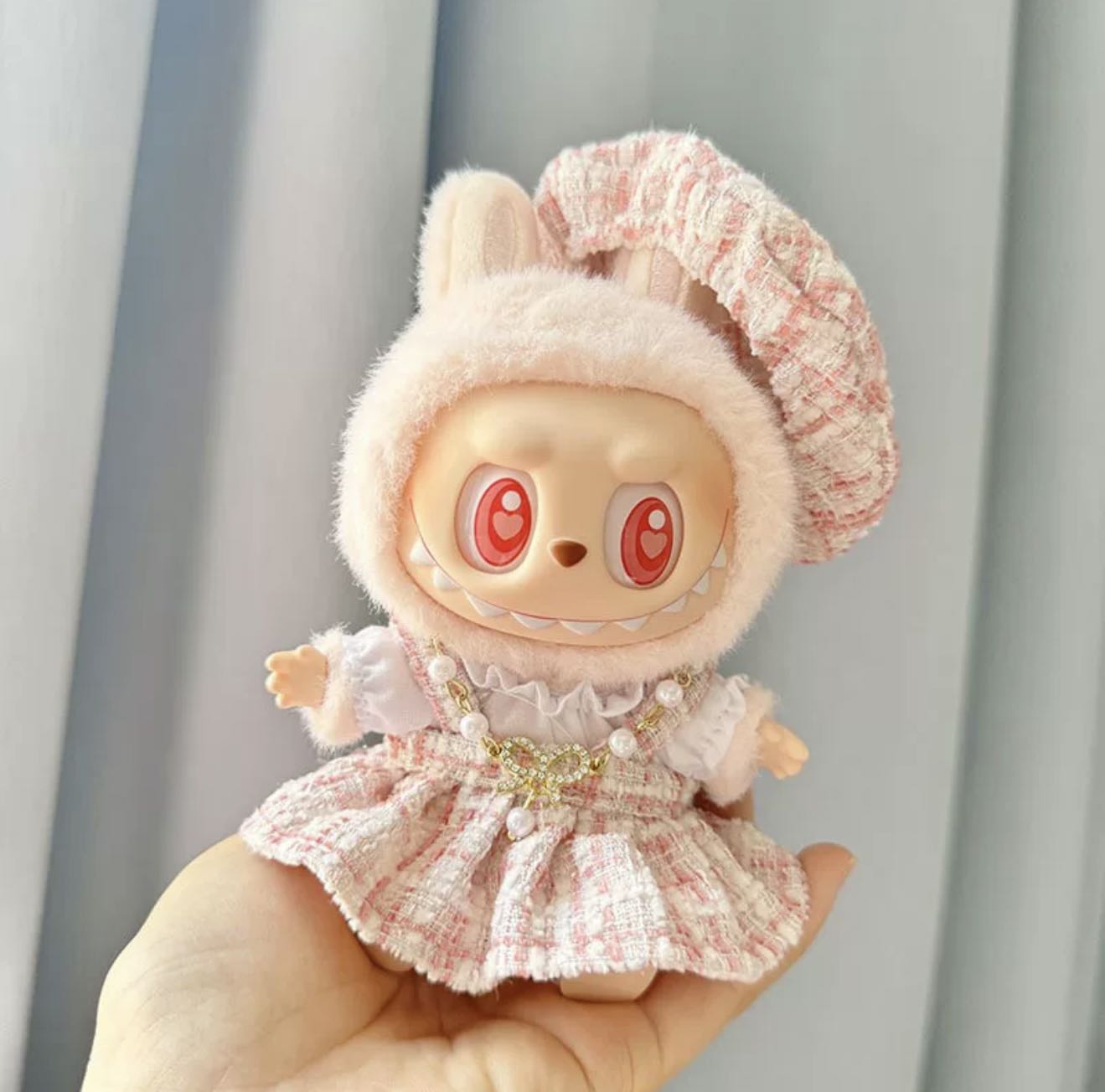 Classic Pink Grid Style Dress Set - Labubu Clothes for Have A Seat